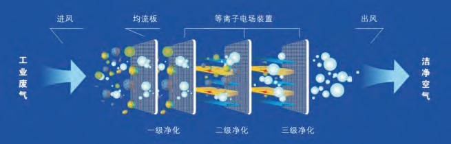 异味气体从气体收集系统收集后,有机废气需要进行预处理,除水后进入等离子体反应区,在高能电子的作用下,使分子受激发,带电粒子或分子间的化学键被打断,同时空气中的水和氧气在高能电子轰击下也会产生OH自由基、活性氧等强氧化性物质,这些强氧化性物质也会与异味分子反应,使其分解,从而促进异味消除 。净化后的气体经排气筒高空排放。