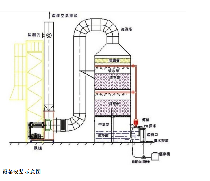 应根据使用情况定期检查塔体底部储液池内液体酸碱度、饱和度及排气口气体净化程度,超过排放标准参数时,应更换底部储液池中或者沉淀池中的药水吸收液。